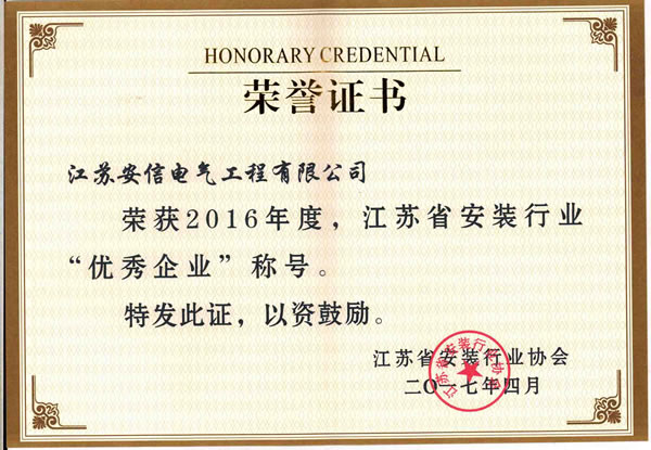 2017年4月,我公司獲江蘇省安裝行業(yè)協(xié)會頒發(fā)的——2016年度江蘇省安裝行業(yè)“優(yōu)秀企業(yè)”稱號。
