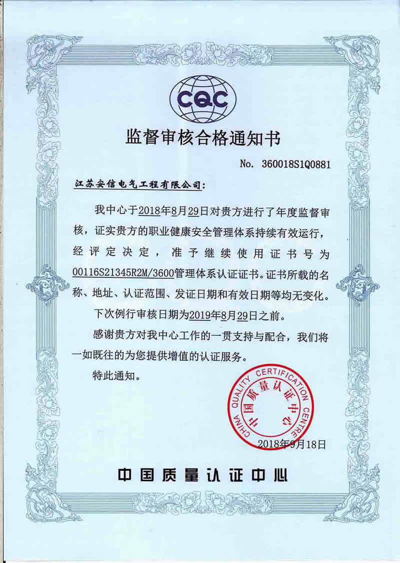 2018年9月,我公司又一次通過了質(zhì)量管理體系、環(huán)境管理體系及職業(yè)健康管理體系,三體系認證年審。我公司將繼續(xù)緊守三體系標準要求,嚴格要求自已,繼續(xù)一如既往提高建設(shè)工程質(zhì)量水平,重視環(huán)境管理,關(guān)注員工職業(yè)健康,保持我公司持續(xù)穩(wěn)健地發(fā)展,為國家電網(wǎng)建設(shè)作出更大貢獻!