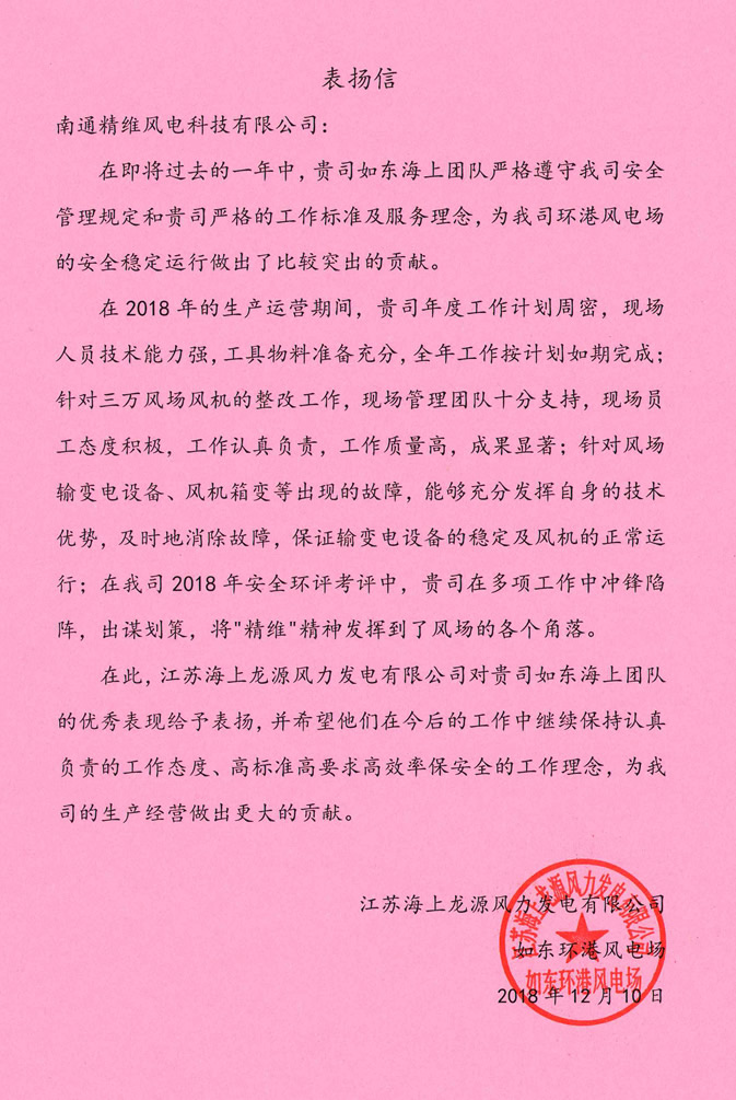 如東海上風場致精維公司的表揚信