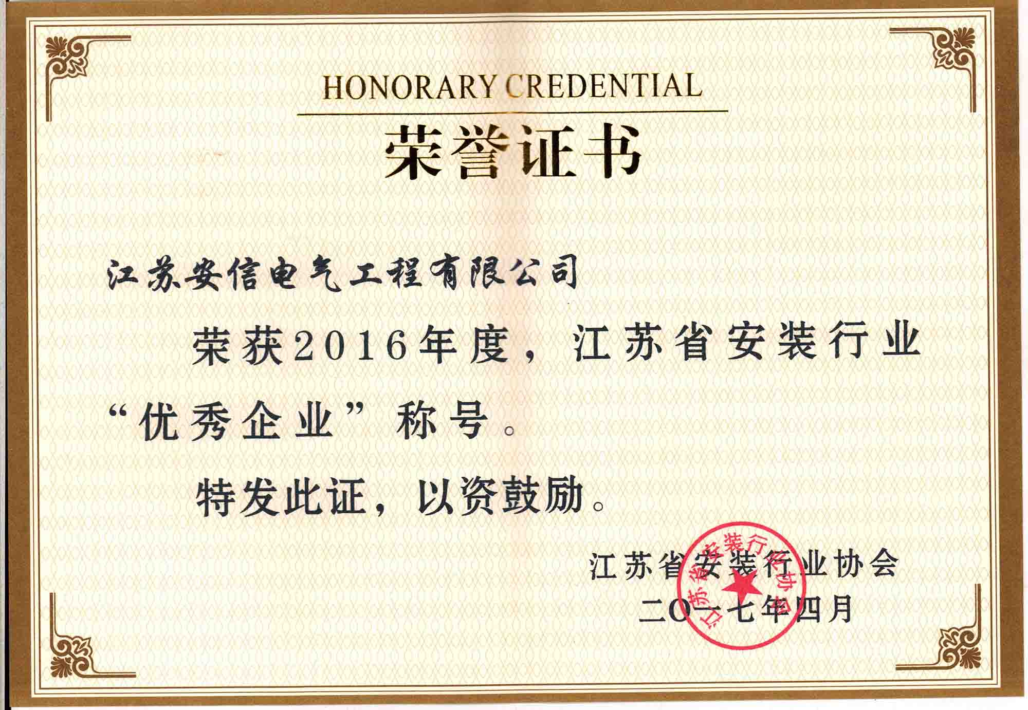 榮獲2016年度江蘇省安裝行業(yè)“優(yōu)秀企業(yè)”稱號
