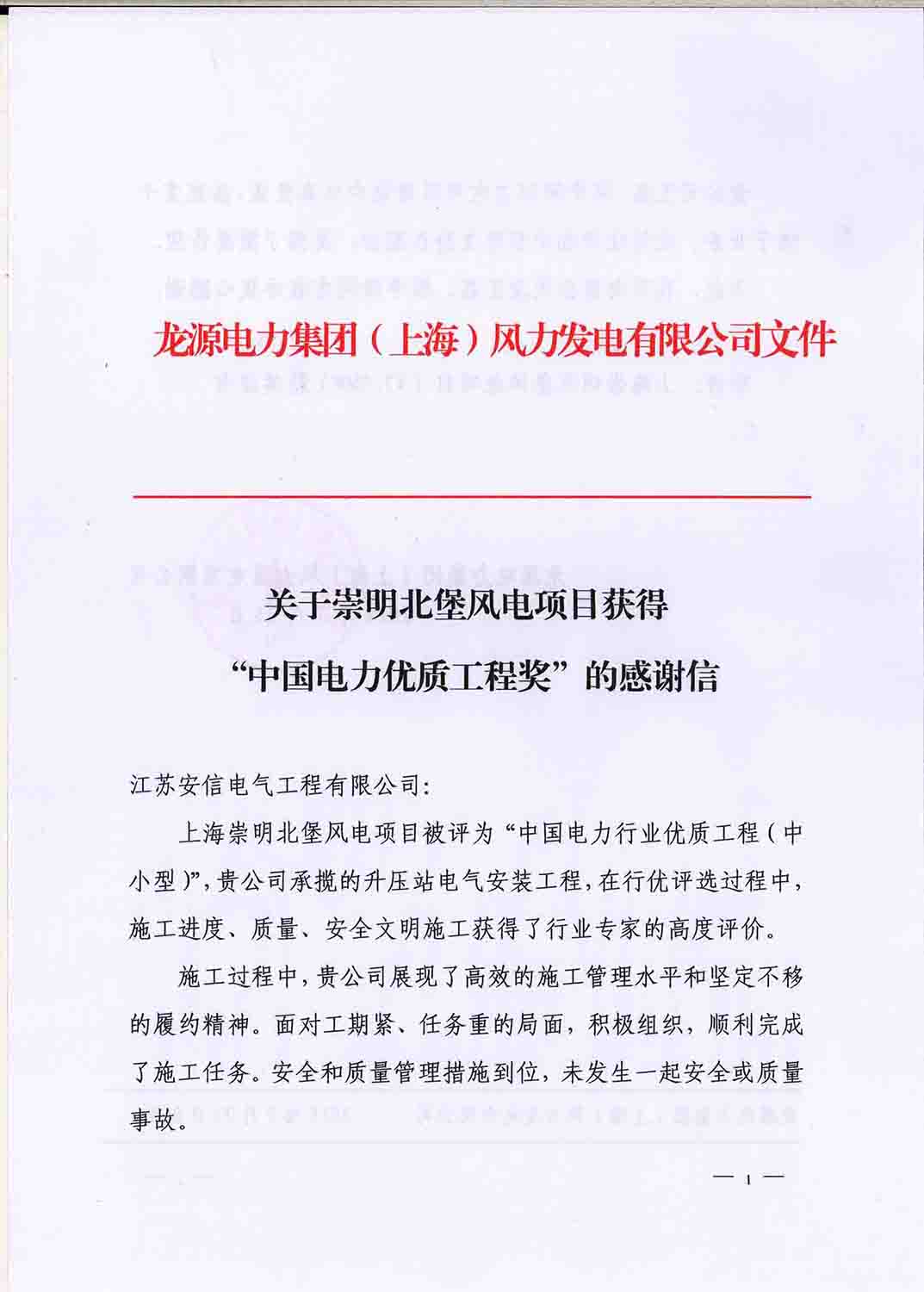 來自上海崇明北堡風(fēng)電項目的一封表揚信